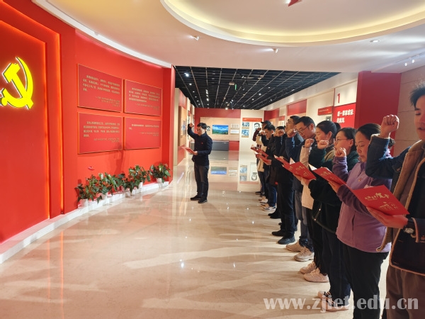 在展馆内,学院党总支的11名党员教师同过政治生日。在学院党总支书记胡小江领誓下,大家重温入党誓词、领取政治生日贺卡,共话初心使命。